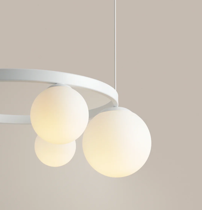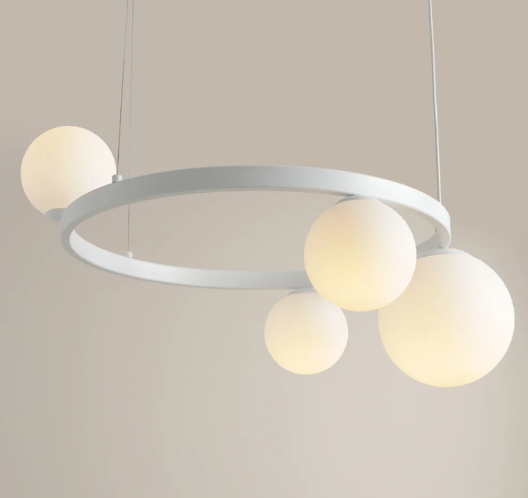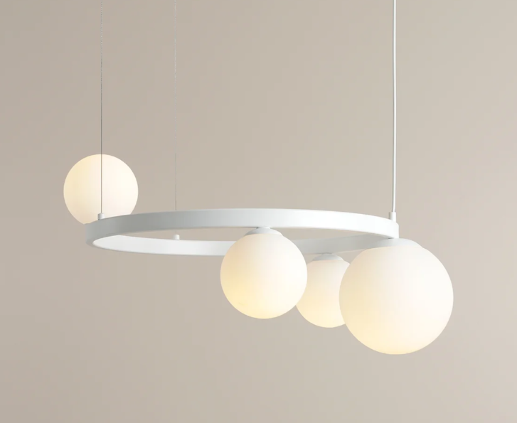 Garda 4 Ring White to stylowa i oryginalna lampa wisząca o niebanalnym, nowoczesnym designie, która pięknie rozświetli przestrzeń nad stołem w salonie lub jadalni. Chętnie wybierana również jako oświetlenie holu czy wiatrołapu. Lampa posiada cztery źródła światła, zamknięte w asymetrycznie rozłożonych na okręgu mlecznych kulach.
